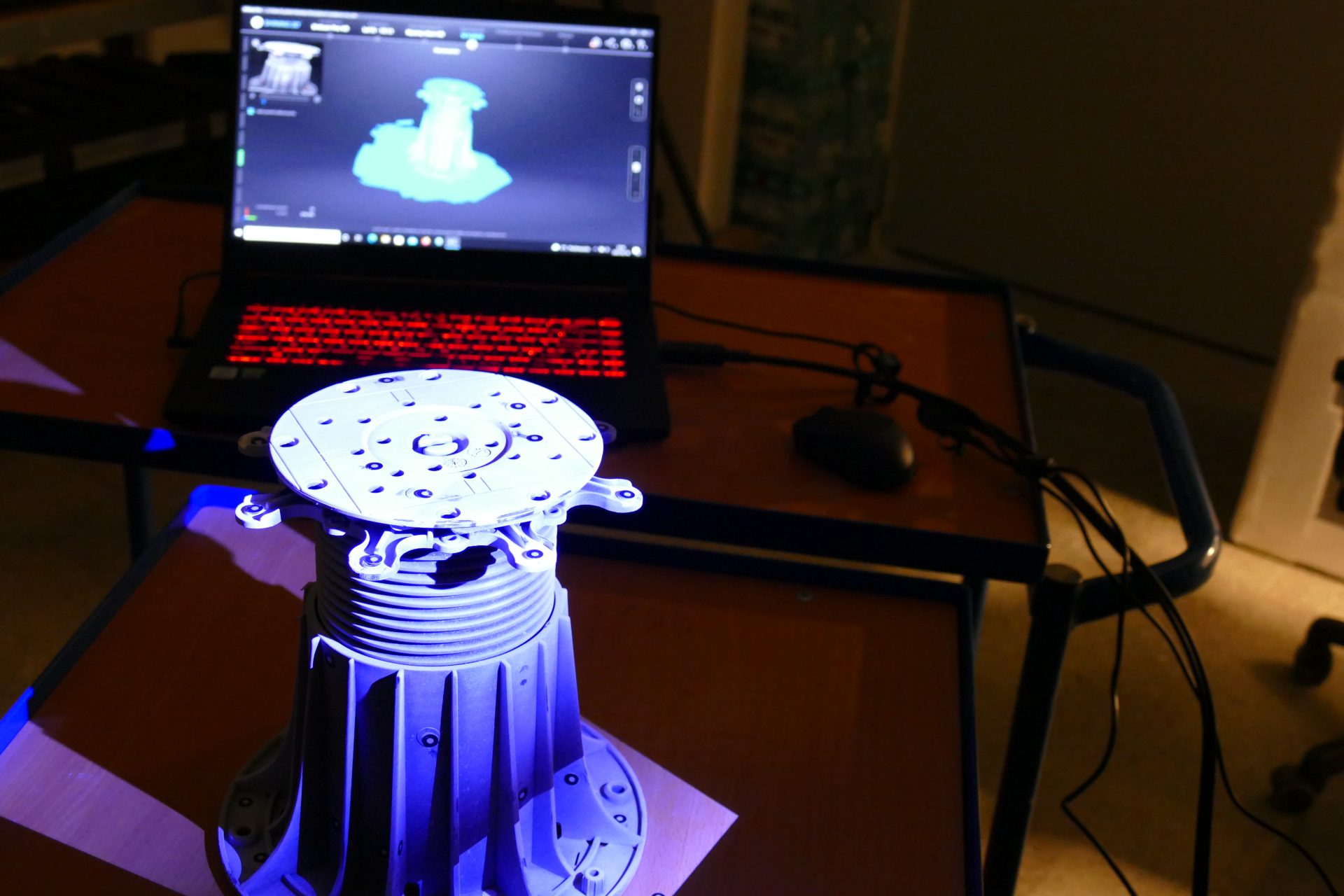 Skaner 3D z możliwością pozyskiwania obrazu małych detali (np. śruby, użebrowanie stali zbrojeniowej, konsole, itp.). Skaner ma tryb obsługi rączej (z dokładnością od 0,1 – 0,045 mm) oraz stacjonarnej z wykorzystaniem stołu obrotowego (z dokładnością 0,04 mm). Pojedynczy obszar odczytu wynosi 300x220 mm. prędkość odczytu wynosi do 3 mln pkt/s.